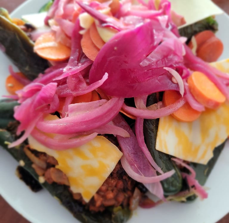 And now for the food. I made Chiles en escabeche colimense (Colima-style stuffed picked peppers). I picked bell and poblano peppers with onions and carrots in vinegar, and stuffed them with crumbled chorizo and sauteed onion and tomato with grated cheese, topped with slices of cheese and pickled vegetables. A little tart from the pickled chiles, a little spicy from the chorizo, a little creamy from the cheese, it's a filling a taste-balanced lunch, not to mention the explosion of color.