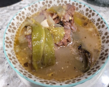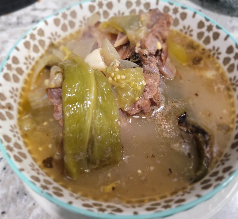 Now for the food. Durango is known for its Caldillo Duranguense, so that's what I made. Basically a soup of green chiles (poblanos) with oxtail & beef neckbones, simmered with onion, garlic, tomatillo (giving it a bright tart profile), and seasoned with cumin and oregano. One of the better successes of the project. Again, recipe courtesy of the inimitable Rick Martinez and his amazing book Mi Cocina.