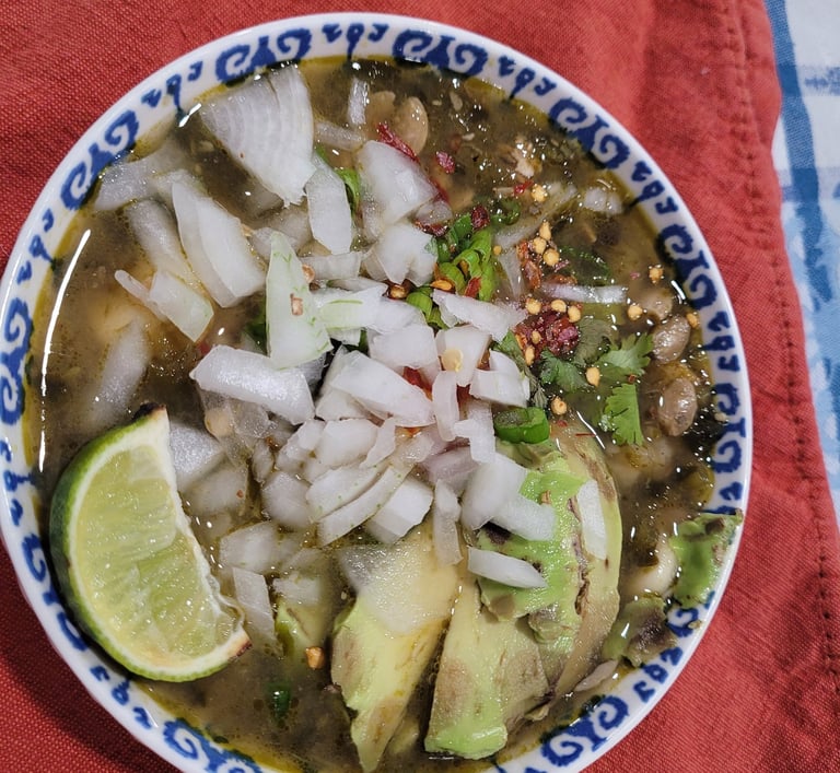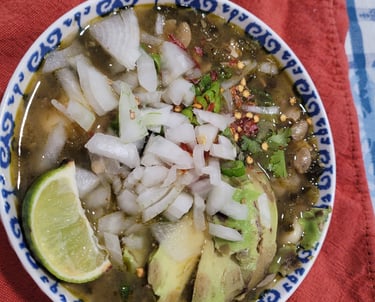 Now for the food. I made Guerrero style pozole, a soup of hominy and meat, popular throughout central Mexico. What makes it Guerrero style is its green color and tart flavor from tomatillos (versions from other states like Puebla or Oaxaca are red or yellow / white - depending on the type of chile or vegetables used). The one constant in any pozole is the hominy in meat (typically pork or chicken) flavored broth and standard toppings of radish, cilantro and chopped onions. It tastes even better the next day as the flavors meld.